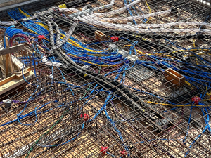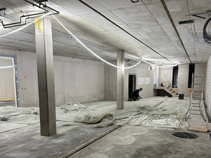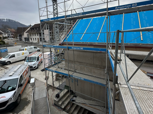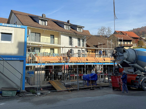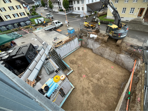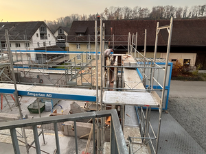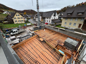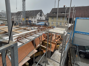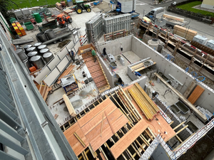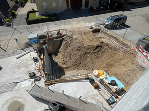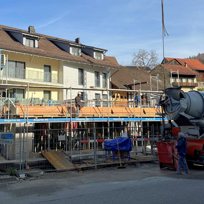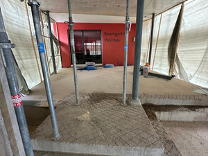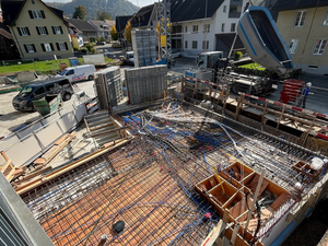 Kaum war der Aushub vollendet und der Kran versetzt, ging es Schlag auf Schlag. Es wurde gehämmert, gebohrt und betoniert. Das Erdgeschoss steht bereits und unser neues Zuhause für Verkauf und Büro nimmt Form an.
